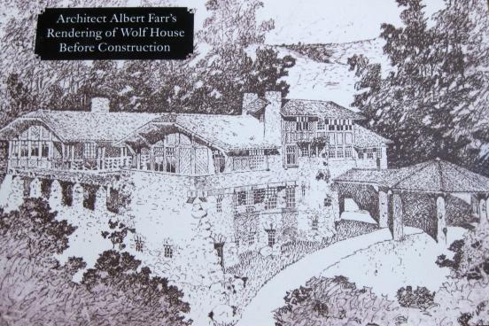 Jack and Charmian's dream home was planned even before their marriage. Actual work on it began April 1911. Albert Farr of San Francisco was the architect who transferred Jack's ideas into blueprints. For earthquake protection, the building was put on a huge floating slab large enough to support a forty-story building. Redwood trees, fully clothed in their own bark, deep chocolate-maroon volcanic rocks, blue slate, boulders and cement were chosen for primary building materials. The roof was of Spanish tile and came from the N. Clark and Sons Pottery, built on the old Davenport place in Alameda. Large redwood trees, with the bark still intact, formed the carriage entrance, the pergolas, and porches. The rafters were of rough-hewn, natural logs. Tree trunks in the gables and balconies were interlaced with fruit twigs for a beautiful effect.